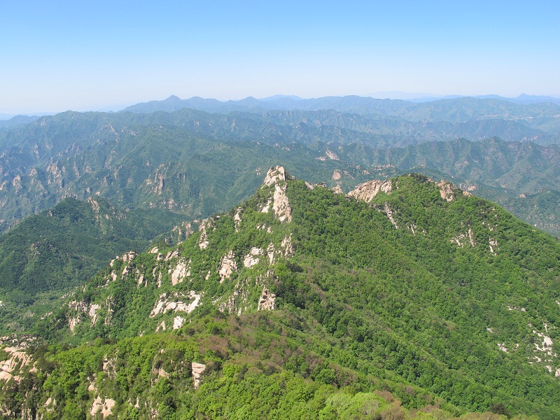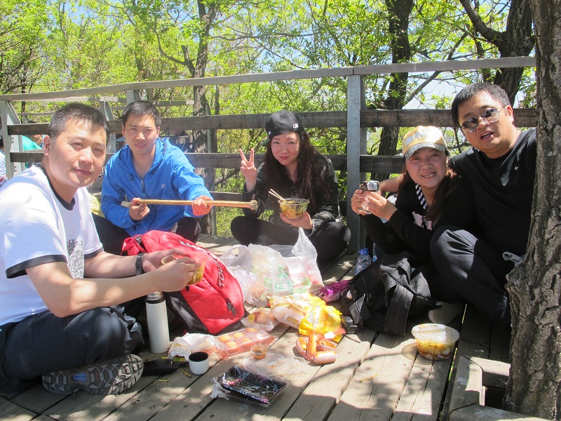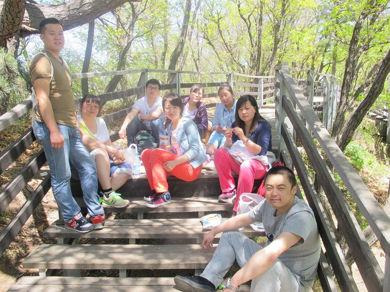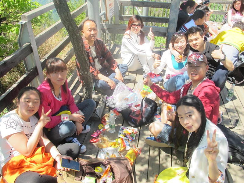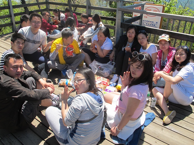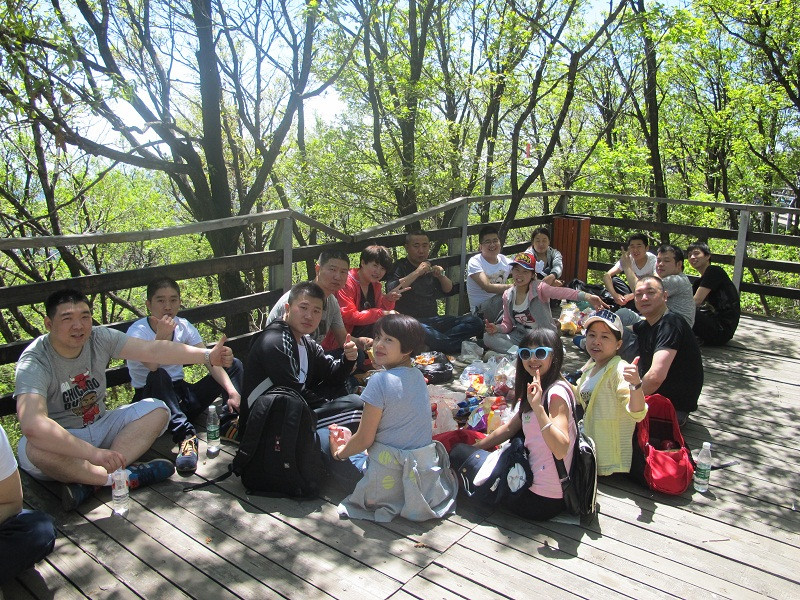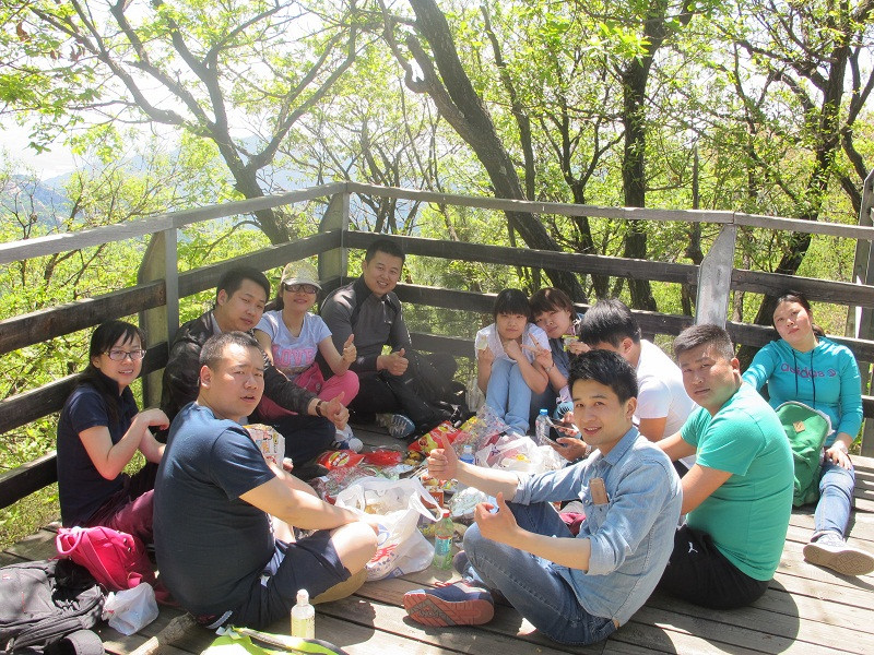 隨著團隊前行,山路越走越崎嶇,坡度參差不一,臺階在平緩了幾步路之后突然變得很陡,每一個伙伴都不時地彎下腰來,手腳并用地往上爬,但我們并沒有退縮,或許每一個小團隊的互相攙扶在我們之間起著作用,或許那一句調侃的“王總來了”給了我們向前的勁頭,或許那從山林哥哥角落傳來的“遠行加油”的呼喊聲讓我們堅持,我們終究達到了山頂。當忽然視野的開闊出現在眼前,當群山真正的在我們腳下,這一路上的辛苦真的什么都不算,所有的疲勞在到達山頂的那一刻煙消云散,眼前不在是窄窄的山路,也不是滿山的草木風景,而是寬廣的天地山川!盡在眼前的疊嶂山巒,伴著伙伴們大聲的呼喊,“會當凌絕頂,一覽眾山小”的氣概充斥胸中!吹著涼涼的山風,心情很是舒暢!當我們坐下來吃零食,一摸臉才發現汗水早已風干,只留下那層細密的鹽,這種小欣喜再加上合影時嘻嘻哈哈的換了,整個遠行的團隊變成了一個能讓自己漂泊的心倍感踏實并安心停靠的港灣!
