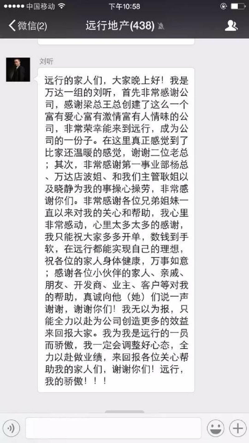 遠行,這兩個字是什么意義?是公司名稱?是;是一群追夢人的代名詞?也沒錯;是溫暖的一個家?的確;或許還有很多的理由,還有很多的解釋。但是我想總有一個理由是叫做“執著”,是你想越行越遠,越站越高的執著,是想忘卻舊時光的你走向新世界的執著,是想讓遠方的親人妻兒安穩生活的自我執著,還有你不甘于平庸,憤然而起的生活態度的執著。企業文化是遠行的靈魂,我們是遠行的新鮮血液。但遠行,同樣也是我們的靈魂,遠行人亦是我們的血液。衷心希望萬達店劉聽可以用最好的心態去面對生活中的磨難,每位遠行人,都愿意陪你一路同行?!ㄍ馕鲄^店 張志彬