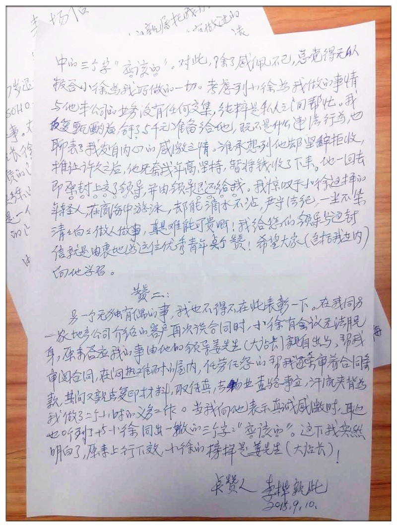 在一個多月的租房過程中,諸如此類盡義務的事,小徐做了許多,付出了許多!但每當我對他表示感謝時,總是聽到他深印腦海中的三個字“應該的”。對此,除了感佩不已,總覺得無從報答小徐為我所做的一切,考慮到小徐為我做的事情與他本公司的業務沒有任何交集,純粹是私人之間的幫忙。我反復斟酌后,拿了5千元準備給他,既不是什么違法行為,也聊表了我發自內心的感激之情。誰成想到他卻堅辭拒收,推讓許久之后,他無奈我年高、堅持,暫將錢收了下來。他一回去即原封上交了領導,并由領導退還給我。我驚嘆于小徐這樣的年輕人,在商海中游泳,卻能滴水不沾、嚴守法紀、一塵不染,清清白白做人做事,真是難能可貴啊!我給您的領導寫這封信就是由衷地為這位優秀青年點個贊!希望大家(包括我在內)向他學習。