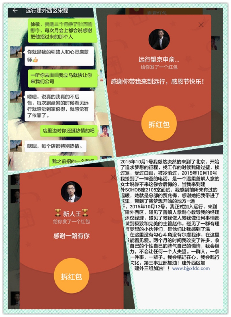 賈兆梅:我想分享兩點,第一就是公司的核心企業文化“團結、感恩、創造、分享”。公司將團結放在第一位,每個人都會互幫互助,大家之間沒有勾心斗角,都懂得感恩,大家一起沖著目標努力,共同創造,共同分享,整個公司形成了一個良好的氛圍;第二就是我們的領導很貼心,不官僚。記得我第一天來公司上班,當天人事部約到量比較高,婁總得知后直接就請客買冰淇淋犒勞我們。還有一次,我參加大興亦莊的月會,回去的時候搭了王總的順風車,本來計劃乘坐王總的車到大興的地鐵口就下車,可王總詢問我的住址發現順路之后就直接把我送到了家門口。這些事對我的觸動很大,我們的老總真的很關心員工,并且我們的老總也必須帶工牌、領帶和司徽,不帶也會被罰錢。這些都是發生在我身邊的真實的事,它讓我體會到了遠行平臺的珍貴與強大!