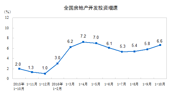 2016年1-10月份,全國房地產開發投資83975億元,同比名義增長6.6%,增速比1-9月份提高0.8個百分點。其中,住宅投資56294億元,增長5.9%,增速提高0.8個百分點。住宅投資占房地產開發投資的比重為67.0%。