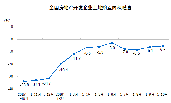 1-10月份,房地產開發企業土地購置面積16873萬平方米,同比下降5.5%,降幅比1-9月份收窄0.6個百分點;土地成交價款6764億元,增長16.7%,增速提高3.4個百分點。