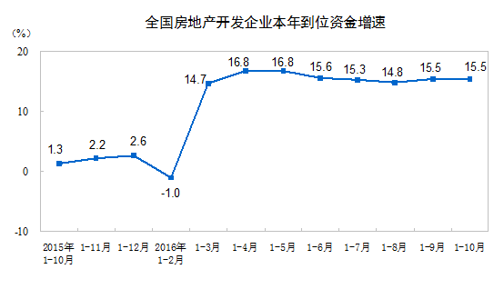1-10月份,房地產開發企業到位資金117261億元,同比增長15.5%,增速與1-9月份持平。其中,國內貸款17303億元,增長1.2%;利用外資123億元,下降49.0%;自籌資金40764億元,增長0.6%;其他資金59071億元,增長35.2%。在其他資金中,定金及預收款33655億元,增長32.2%;個人按揭貸款19783億元,增長51.5%。